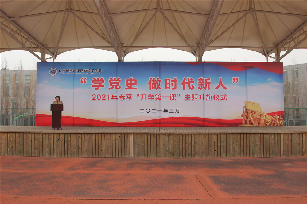 党委书记高玉英发表讲话。她指出,2021年是中国共产党建党一百周年和国家“十四五”规划开局之年,学院全体师生要深入学习贯彻习近平总书记在党史学习教育动员大会上发表的重要讲话精神,做到学党史、悟思想、办实事、开新局,通过同升一面旗、共唱一首歌,激发历史责任感、使命感和爱党爱国情怀,以昂扬姿态奋力开启2021年春季学期新征程。