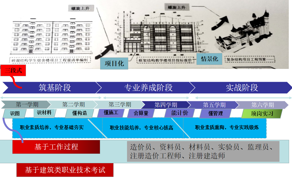 二、专业介绍: 1.培养目标 立足辽宁,辐射东北,培养适应工程造价类技术转型升级及创新的需要,具备工程识图和建筑施工技术等基本专业知识,具备土建、装饰、安装工程计量与计价的专业技术能力,具备基于BIM技术的工程量计算能力,具备坚定社会主义理想信念和良好职业道德、创新创业能力、可持续发展基础能力的德智体美劳全面发展的技术技能人才。 2.人才培养模式:工程造价专业实行“双基,三阶段,一个提升”