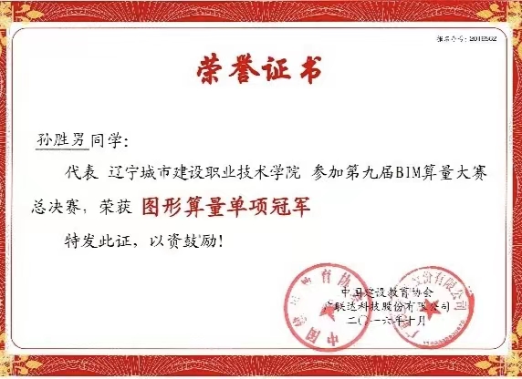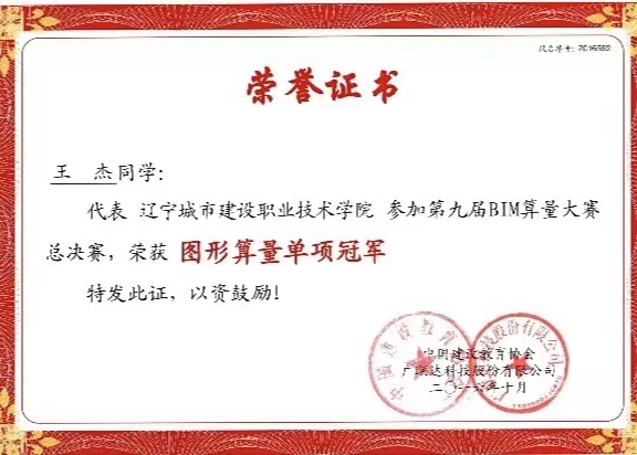 六、学生获奖情况 近年来,专业学生获得全国第九届BIM算量大赛等省级以上技能竞赛奖励12项,其中特等奖1项、一等奖3项、二等奖6项,3等奖2项。
