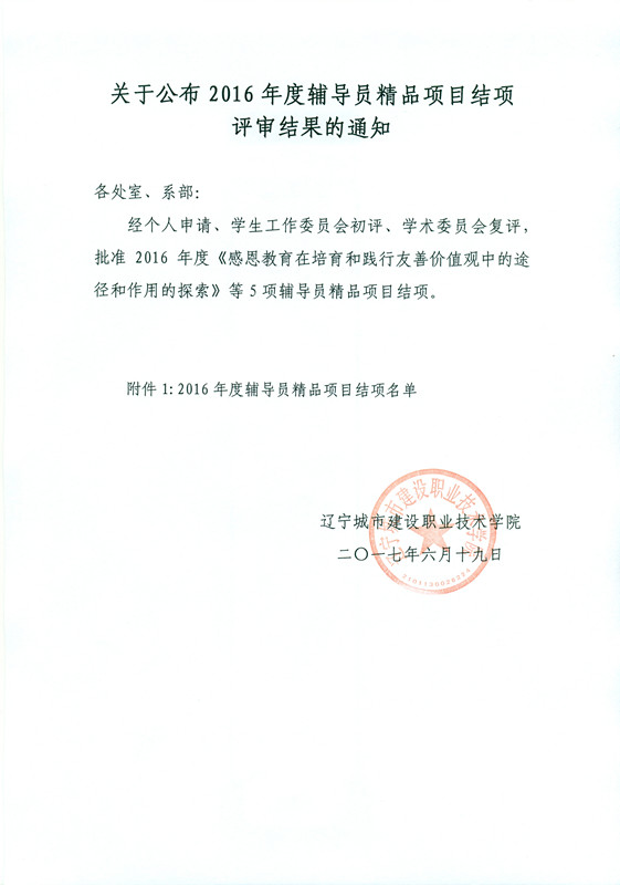 关于公布2016年度辅导员精品项目结项评审结果的通知