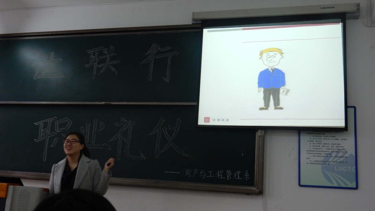 我院房地产与工程管理系于11月3日下午1:30在A233举办“沈阳世联企业职业礼仪规范”讲座。讲座由沈阳世联兴业房地产顾问有限公司亚净老师主讲。