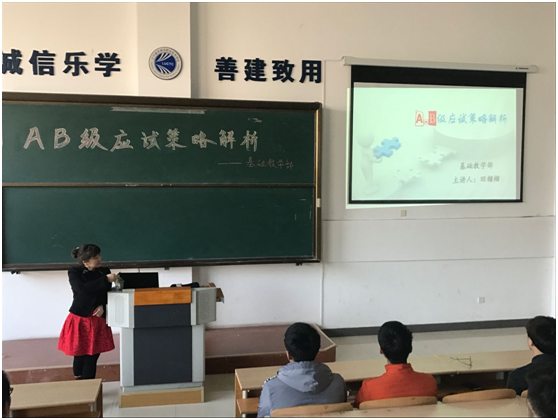 12月2日下午,我院基础教学部英语教研室田榴榴老师在阶梯202教室为全院即将参加A、B级考试的学生进行了一次关于《A、B级应试策略解析》的讲座,其内容充实,讲解精彩,深入浅出地为学生们介绍了考试题型、答题技巧以及考试注意事项。通过讲练结合、举一反三等方式,使得讲座气氛严肃又不失活跃,深受学生们的喜爱。学生们都纷纷表示,这次讲座让他们对即将到来的A、B级考试有了更多的了解,增进了他们过级的信心,对他们过级以及今后的英语学习大有裨益。