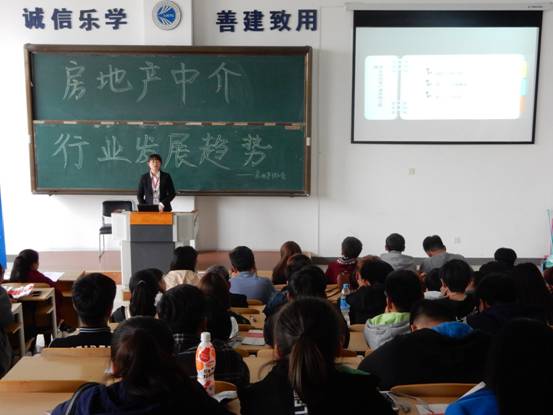 在近两个小时的专题报告中,两位老师分别向学生们介绍了沈阳市尤其是浑南的房地产发展情况;沈阳市中介的发展现状以及未来发展前景,并通过自己的亲身经历讲述房地产飞速地发展给就业带来广阔前景。