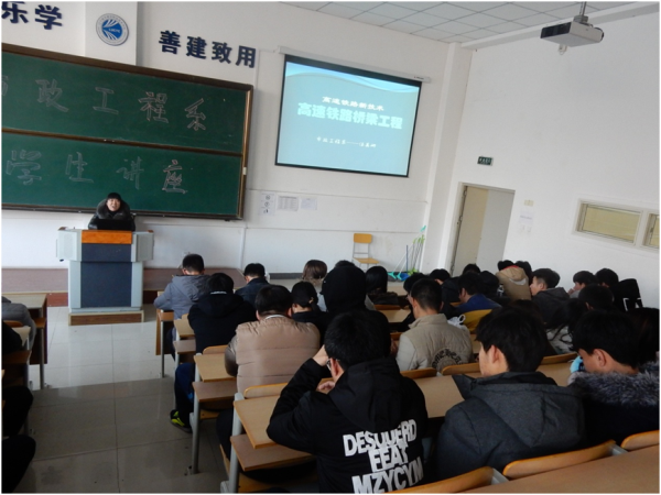 讲座上,汤美娜老师结合目前国家高铁项目的规划及施工技术的发展,理论联系实际,给同学们介绍了“高铁桥梁施工新技术”,重点阐述了“高铁桥型”、“高铁桥梁基础施工”、“高铁桥墩施工”及“高铁桥梁支座施工”和“高铁桥梁上部结构施工”等知识。汤老师结合京沪高铁简支梁桥进行讲解,加深学生们对高铁桥梁的认知,随后她利用多媒体对京沪高铁施工进行了展示,让学生们有了感性认识。