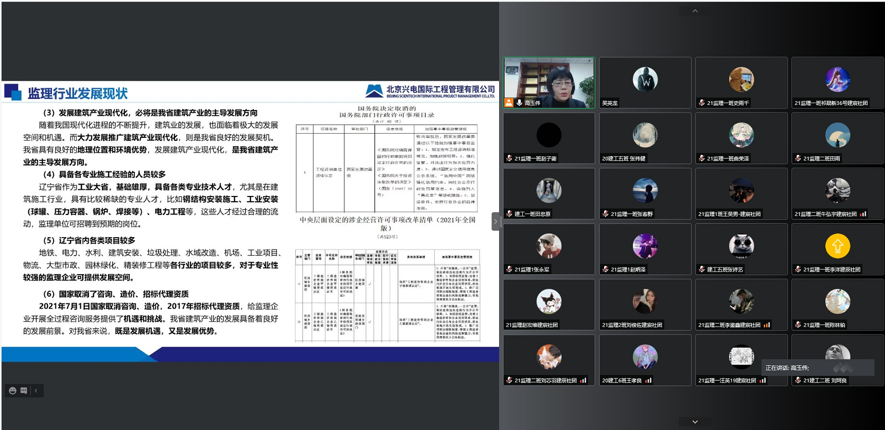 高总从监理行业发展历程、发展现状、发展举措和建议、未来发展趋势及监理行业对人才的需求共五个方面给同学们进行了详细介绍。