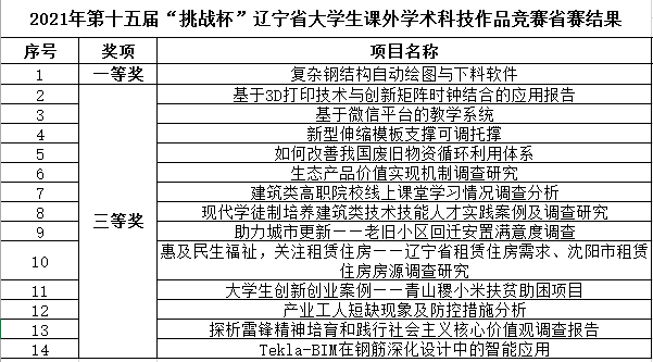 5月14日—16日,由共青团辽宁省委员会、省教育厅、省人力资源和社会保障厅等7家单位联合主办的2021年第十五届“挑战杯”辽宁省大学生课外学术科技作品竞赛在大连理工大学举行。我院张俏、刘玉波、刘悦老师指导的作品《复杂钢结构自动绘图与下料软件》获得一等奖。