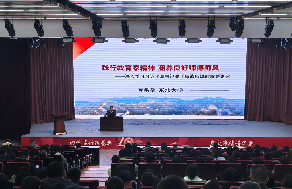 东北大学宣传部副部长曹洪滔教授应邀作题为《践行教育家精神 涵养良好师德师风》报告。曹洪滔教授围绕三个关键方面展开深入讲解,他深度剖析习近平总书记关于师德师风重要论述背后的时代背景与深远意义,让教职工深刻理解新时代对教师师德师风的新要求,详细解读教育家精神的内涵与价值,强调这一精神对教师职业发展和教育事业的重要推动作用,并结合实际案例,为教职工提供牢记立德树人使命、涵养师德师风的切实可行的方法与路径,引导大家坚守教育初心,践行育人使命。