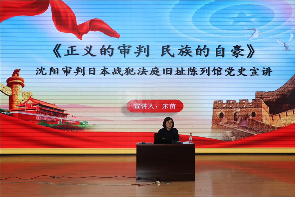 仪式后,沈阳审判日本战犯法庭旧址陈列馆副主任宋苗作了“正义的审判 民族的自豪”主题宣讲,并受聘成为我院校外辅导员。