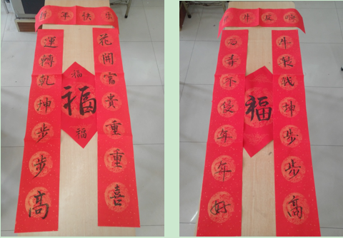 “花开富贵重重喜,运转乾坤步步高”、“百花齐放春光好,万马奔腾气象新”、“兴承鼠运旧尘去,气冲牛斗新志酬”、除了汉字,还有用藏文书写的对联。红红的对联、浓浓的墨香,学生们在布置好的具有节日气息的教室内,和老师们共同挥毫拨墨,每一个字都书写着对新春最美好的祝福。