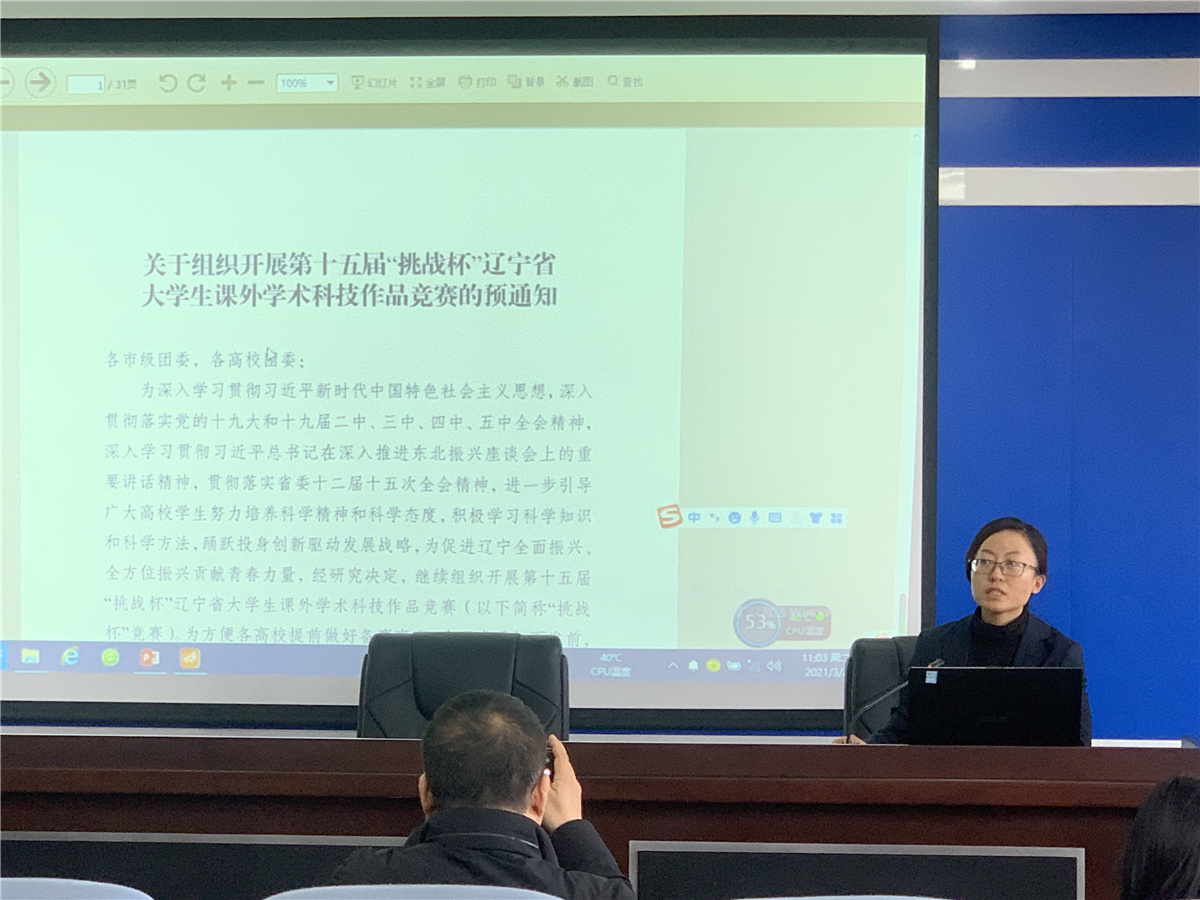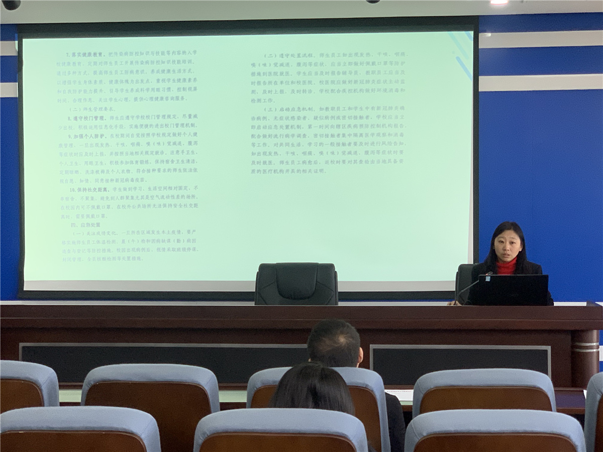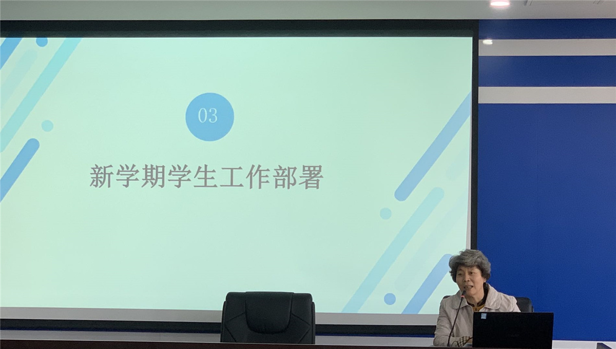 会议首先由校医为各系普及春季流行病的相关知识及如何应对各类流行病进行培训,并强调通风、消毒、佩戴口罩及每日晨午检的重要性;然后由学生处处长曾铄就新学期的学生返校注意事项、日常的学生管理、学生请假的相关流程具体工作做了落实;再由团委副书记岳兵就第十五届“挑战杯”辽宁省大学生课外学术科技作品竞赛相关的文件进行了解读。