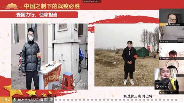 此次爱国主题网络班会顺利召开,同学们更加坚定制度自信,坚信战“疫”必胜,同时筑牢了同学们爱党爱国爱社会主义的赤子之心。同学们纷纷表示:要积极响应国家和学院的号召,用自己的实际行动助力疫情防控,做科学防疫的宣传者、做不传谣不信谣的守护者、做关爱他人的奉献者,用努力学习网课打造实力报国的硬核力量,未来更好地投身到党的伟大事业、国家的发展建设中,为实现国家富强、民族振兴、人民幸福的伟大梦想贡献自己的青春力量。