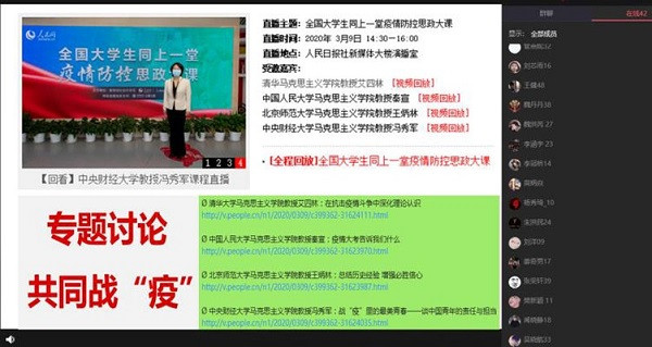 3月9日至3月13日,为全面贯彻落实教育部社科司、省教育厅关于组织开展“全国大学生同上一堂疫情防控思政大课”的通知要求,我院3000余名学生、党员干部、教职员工通过人民网教育频道、班级在线课堂等载体开展了直播、回看全国思政大课学习、讨论活动。