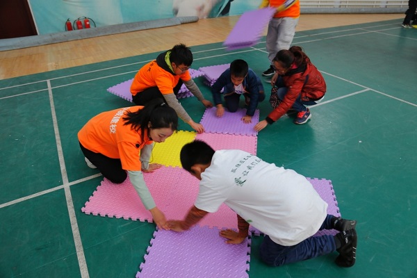 学院筑砼心理协会和阳光心理社团的志愿者们从小朋友走下车就开始,与各个小朋友手拉手一起用脚步丈量美丽的城建学院。在校园里为小朋友们精心准备了游戏项目,包括车轮滚滚、摸石过河、一圈到底、爱心驿站等多个项目,志愿者们带着小朋友们一起做游戏,全场气氛很活跃。为了鼓励小朋友交流与表达,志愿者与小朋友们一起完成项目,并根据实际情况结合小朋友们的意愿和理解水平,现场和小朋友们创造很多新的游戏项目。爱心驿站中,志愿者们鼓励小朋友们用EVA地垫搭建他们喜欢的爱心小屋,拼好后可以邀请其他小朋友、大朋友一起来参观,有的小朋友没有搭建成功,志愿者们就动员其他小朋友一起来协助完成,鼓励小朋友们相互帮助、相互交流。