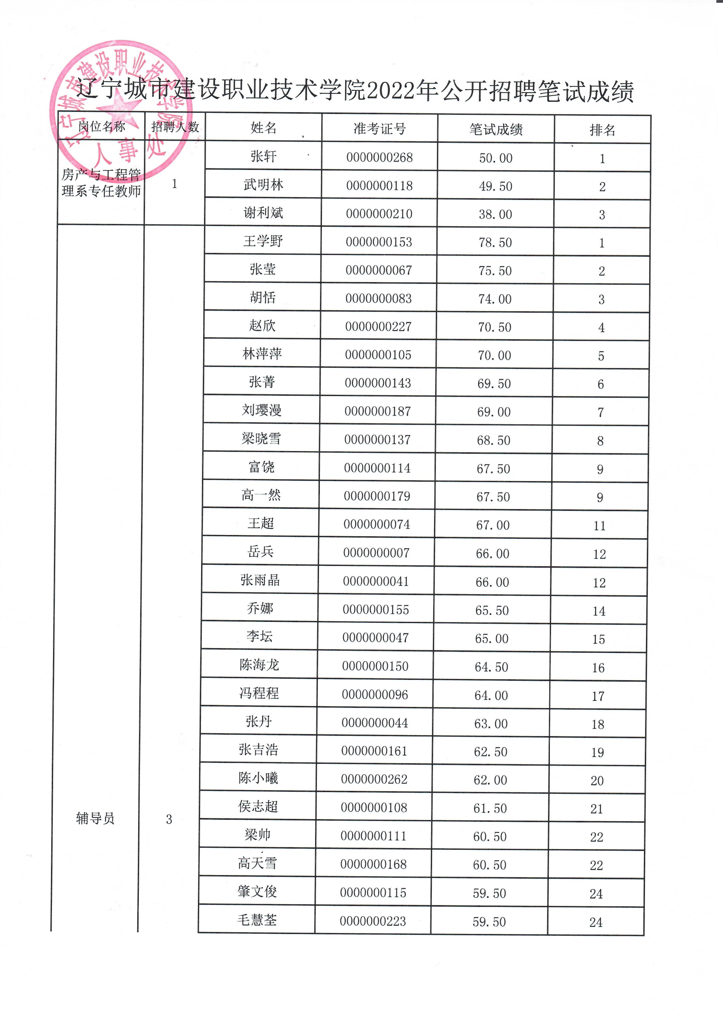 学院2022年公开招聘笔试工作已完成,现将笔试成绩进行公示,笔试合格分数线为35分,面试按招聘计划与面试人数1:3的比例,根据笔试成绩从高到低的顺序,确定各岗位参加面试人员。最后一名面试人员的笔试成绩并列者,同时参加面试。面试相关事项即将发布,请面试人员随时关注电子邮箱及学院官网公招报名系统,并保持通讯畅通。