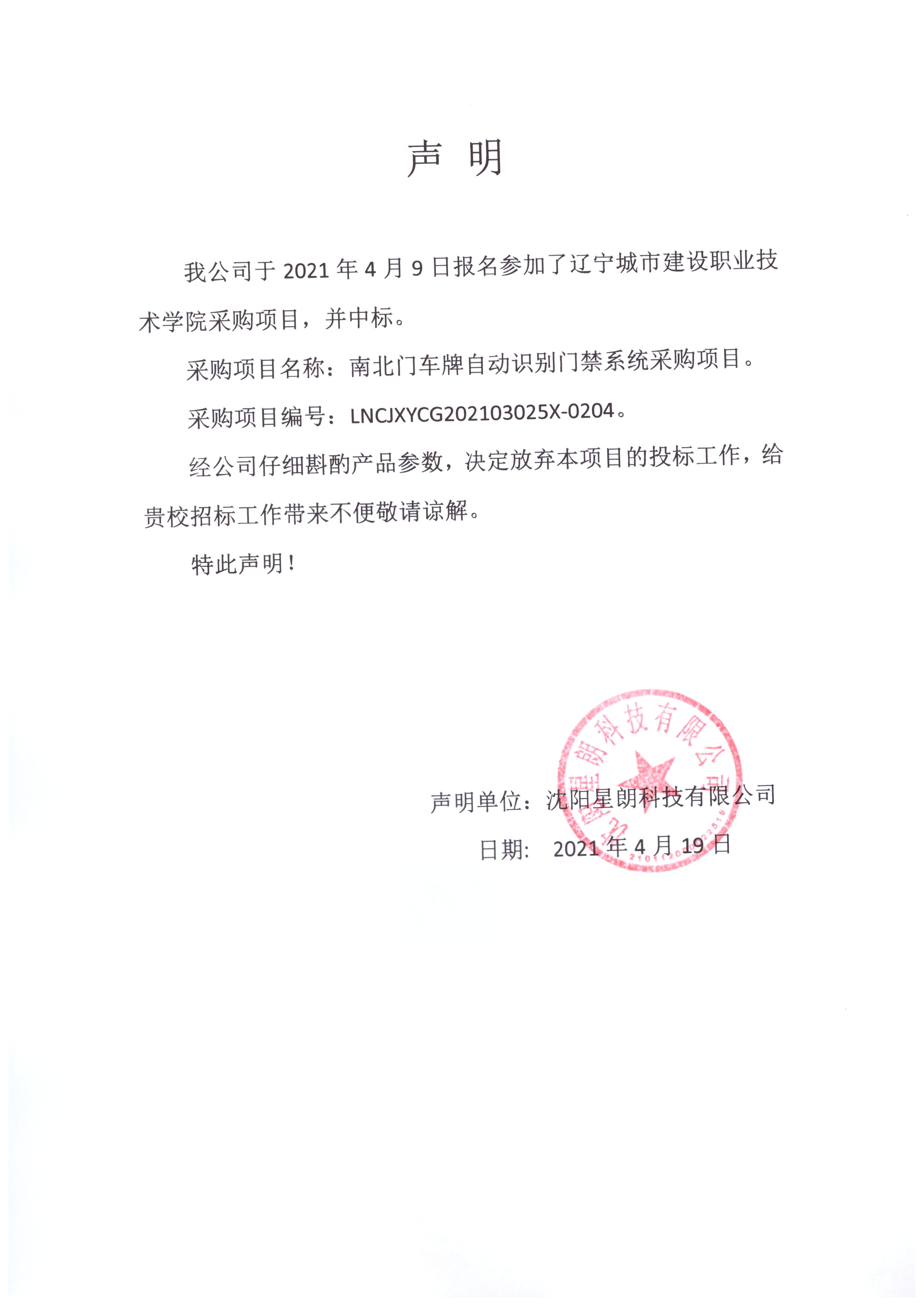 由于第二次公告后中标供应商沈阳星朗科技有限公司递交弃标声明详见附件2,我学院现对 南北门车牌自动识别门禁系统采购项目 (招标项目编号:LNCJXYCG202103025X-0204)进行第三次校内公开招标采购,现欢迎符合要求的投标人参加本次采购活动。
