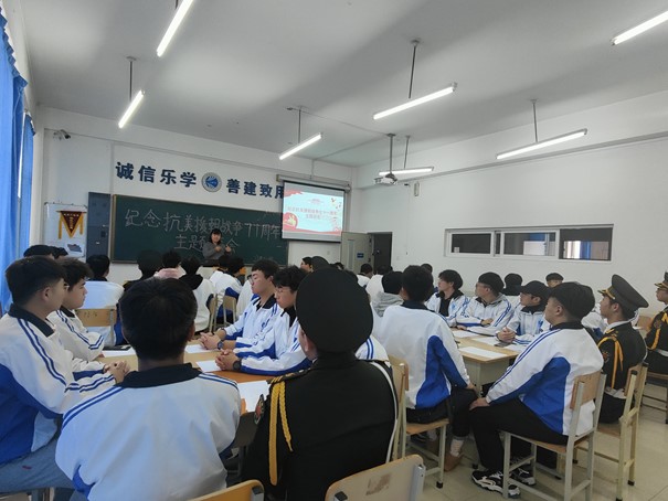 此次主题班会从师生共同收集抗美援朝战争的相关资料开始,通过抗美援朝战争主题PPT介绍了战争的历史背景、战争过程到停战协议的签署。通过播放相关视频、齐唱《中国人民志愿军战歌》、角色扮演抗美援朝英雄人物、讲述英雄事迹等环节,重现了当年的战斗场面,感受人民志愿军的伟大形象,激发了同学们对英雄的敬意和强烈的历史责任感、使命感。