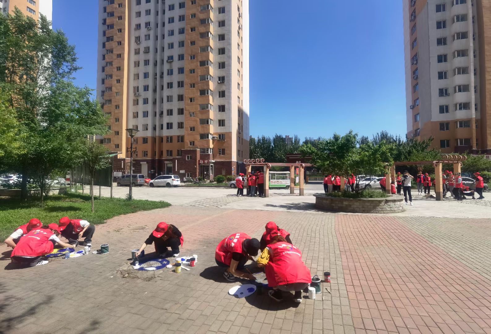 演出前,志愿者们面向社区办公室和居民园区开展了志愿服务活动。对园区的井盖、凉亭、墙面等区域进行涂鸦装点,为建党百年营造了节日氛围。