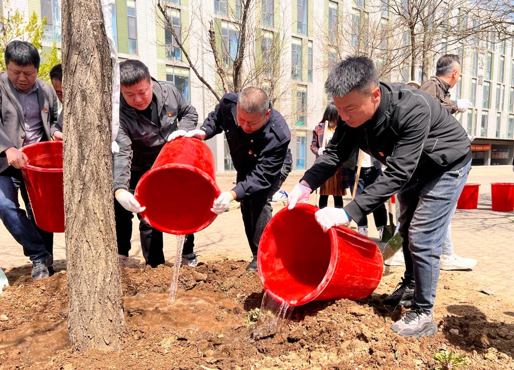 植树活动中,党员们干劲十足,相互配合,分工协作,有的扶苗栽种,有的挥锹培土,有的浇水灌溉,每个环节都衔接得井然有序。通过大家的努力,新植的树木昂然挺立,在和煦的微风中萌发盎然生机,为校园增添了一抹盈盈新绿。