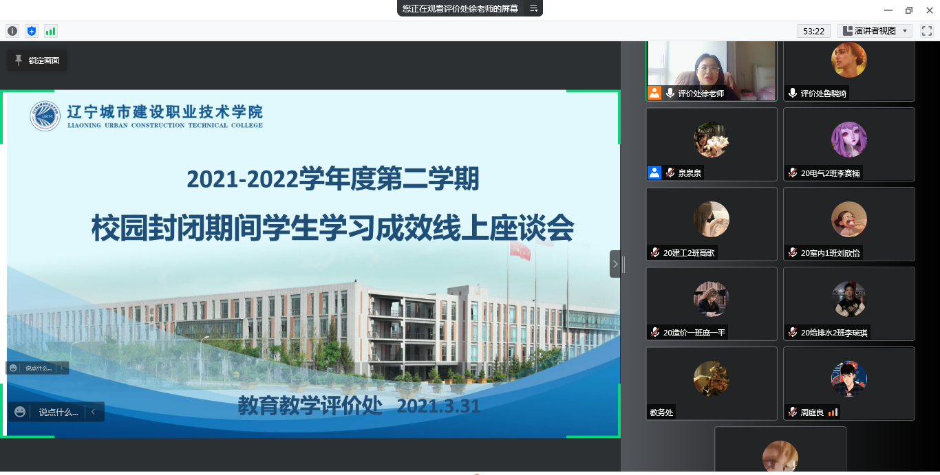 为进一步了解校园封闭期间学生线上学习成效及对线上教学的需求,更好地促进学院线上教学工作有序开展,学院于3月31日下午召开了学生学习成效线上座谈会。教育教学评价处处长徐艳、教务处处长姜锐、教育教学评价处相关教师以及学生信息员代表参加了会议。
