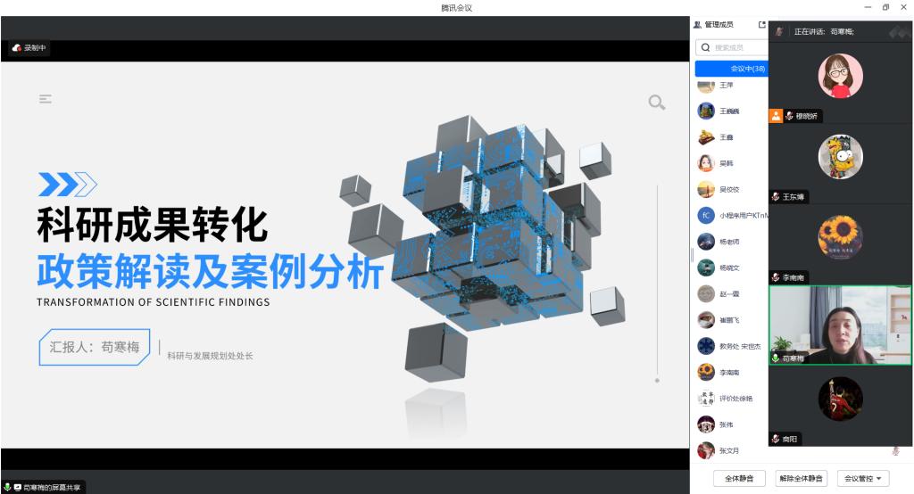会上,苟寒梅从科研成果转化的基本概念、意义、相关法律法规等方面进行了全面系统的介绍;结合实际案例,从科研成果转化流程、存在的问题、解决路径以及其他相关重要内容等方面进行了详细的讲解。同时,苟寒梅就与会教师提出的科研成果转化相关问题给予了悉心解答与指导。