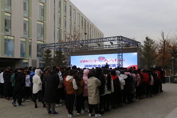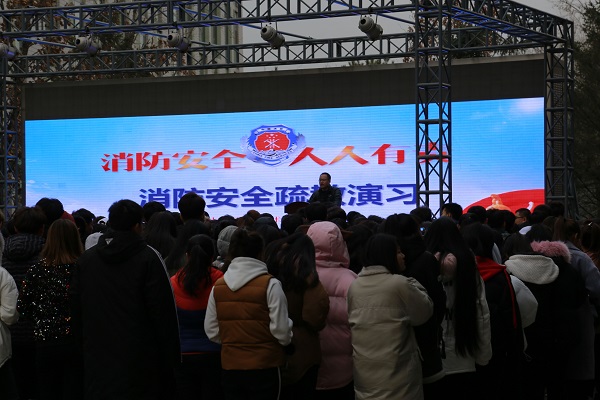 消防演习前由学生处副处长齐振军宣读演习程序。学生公寓警报拉响后,广播播报险情紧急疏散通知,全体师生员工在疏散组指引下迅速撤离现场,全体师生疏散到露天舞台前集合,圆满完成此次疏散演习任务。