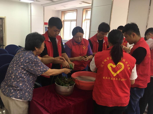 6月14日,建筑设备系志愿者们在社区工作人员的带领下来到社区活动中心,为老人送上慰问品,并学着包粽子。活动期间,同学们通过与全国道德模范张振杰老人谈心谈话,了解到他对于生活的热爱以及对志愿活动积极,一致表示要向他学习,继续为志愿服务奉献自己的一份力量。社区工作人员对结对共建工作表示满意,希望把此项工作继续做好、做精。