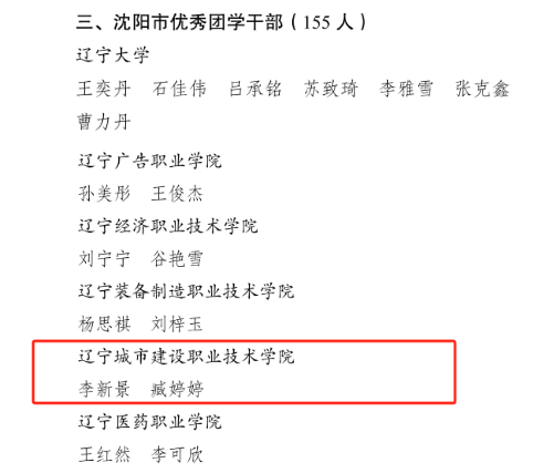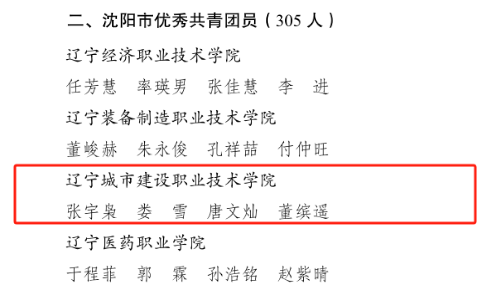 近日,共青团沈阳市委员会、沈阳市学生联合会发布了《关于2023年“沈阳市十佳大学生”“沈阳市优秀共青团员”“沈阳市优秀团学干部”的表扬通报》(沈团联发〔2024〕9号),KY开元2021级市政1班张宇枭、装饰2班娄雪、供热班唐文灿,2022级市政1班董缤遥等4名同学荣获“沈阳市优秀共青团员”称号;2022级监理2班李新景、2021级造价2班臧婷婷等2名同学荣获“沈阳市优秀团学干部”称号。