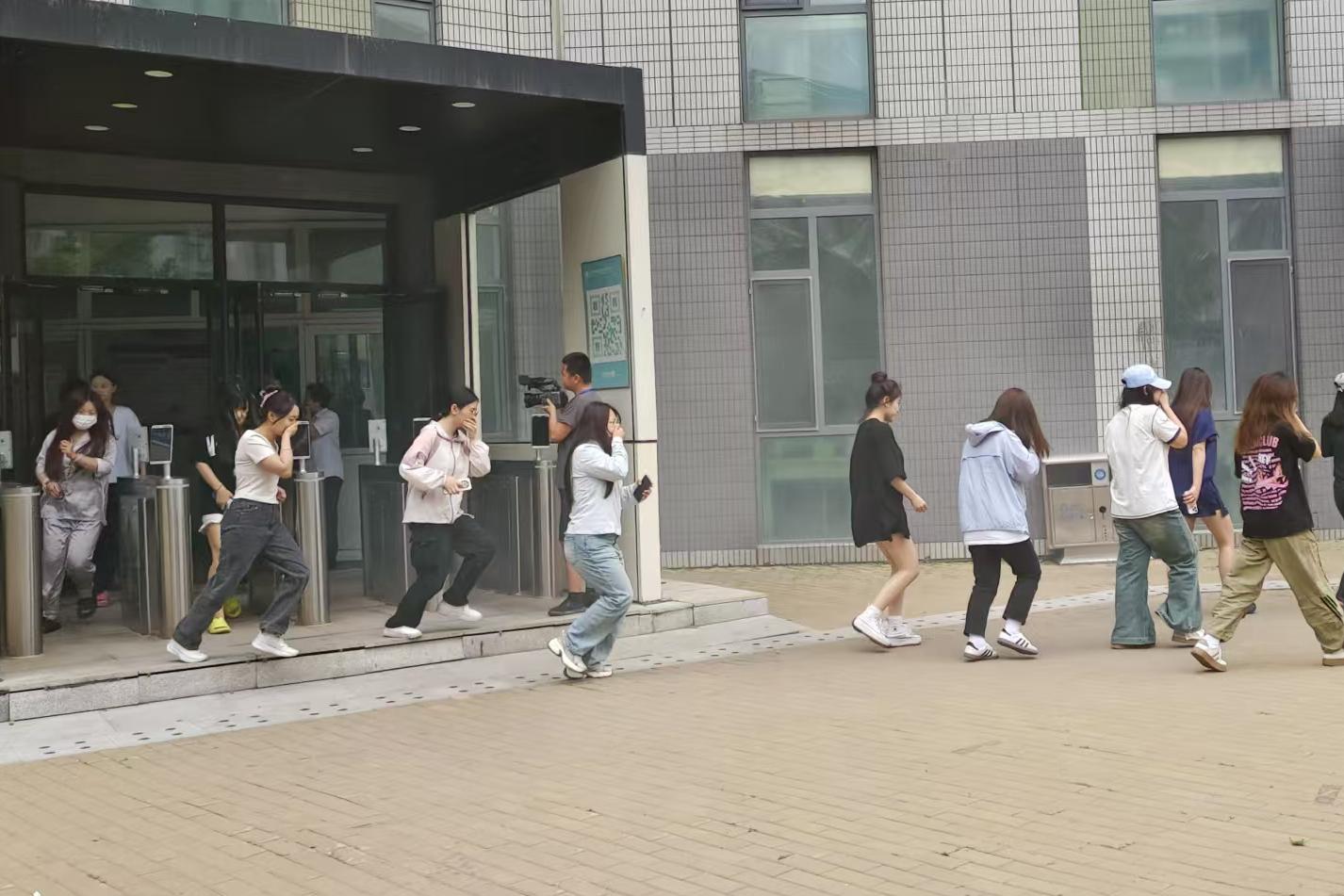 演练中,模拟在学生公寓五楼某寝室发生火情,现场燃起人造烟雾,公寓管理人员第一时间开启公寓门禁并拨打火警电话;全体师生在广播的指引下,用袖子或湿毛巾捂住口鼻弯腰扶墙,迅速从最近的安全出口转移到露天舞台集合,并清点人数进行报告,完成疏散演练全过程。