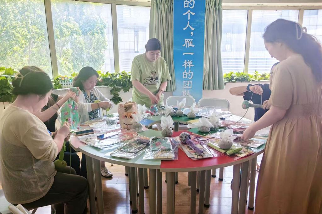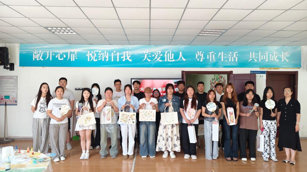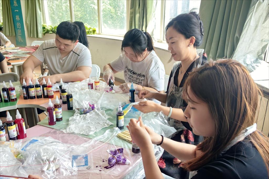 活动现场,植物拓染、抱枕扎染、艾草锤制作、漆扇工艺四大非遗体验项目有序展开。师生们将叶片置于布料上,用木槌反复敲打,将自然的脉络与色彩永久封存;以线为笔,勾勒出独特图案,浸染出渐变色彩;将传统中医药智慧融入一针一线,亲手填充出承载健康寓意的手工锤;在扇面上描绘传统纹样,感受东方美学的独特韵味。不少同学别出心裁,将校园标志性建筑、校训等元素融入作品,寄托对母校的深厚眷恋。