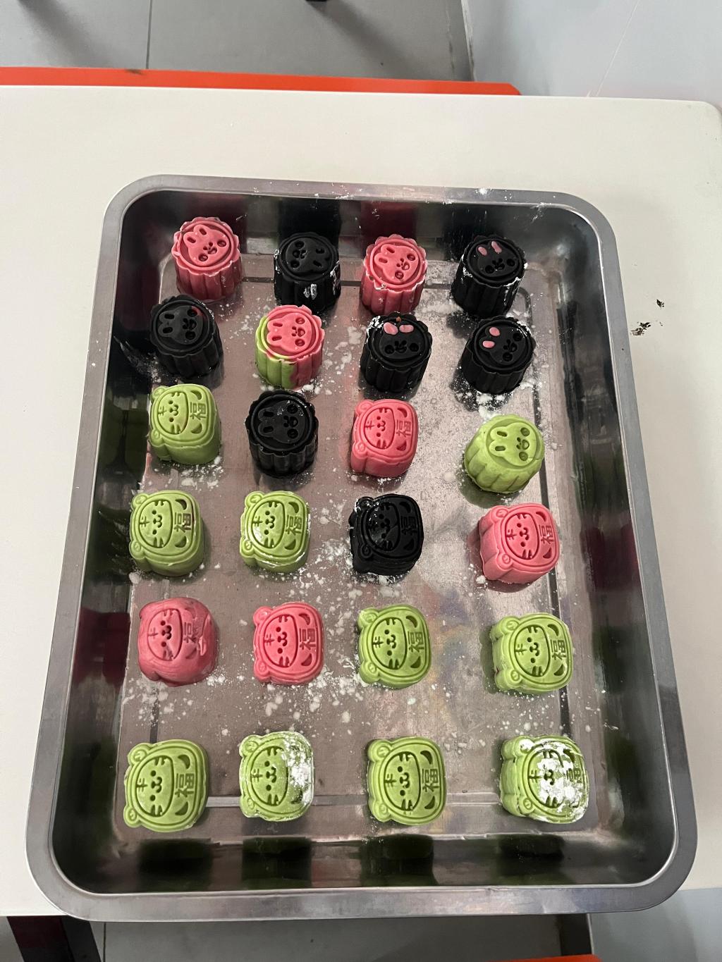 活动现场,王琛老师向送同学们送上节日祝福,并为同学们分发了提前准备好做冰皮月饼需要的预拌粉、馅料、模具等物品。师生一齐动手和面、称重、擀皮儿、包馅儿、定模,软糯的饼皮搓圆摊平,裹进香甜的馅料,用手指慢慢收口,再裹上面粉,放入造型各异的模具,在认真创作下,一个个精致的冰皮月饼诞生了。