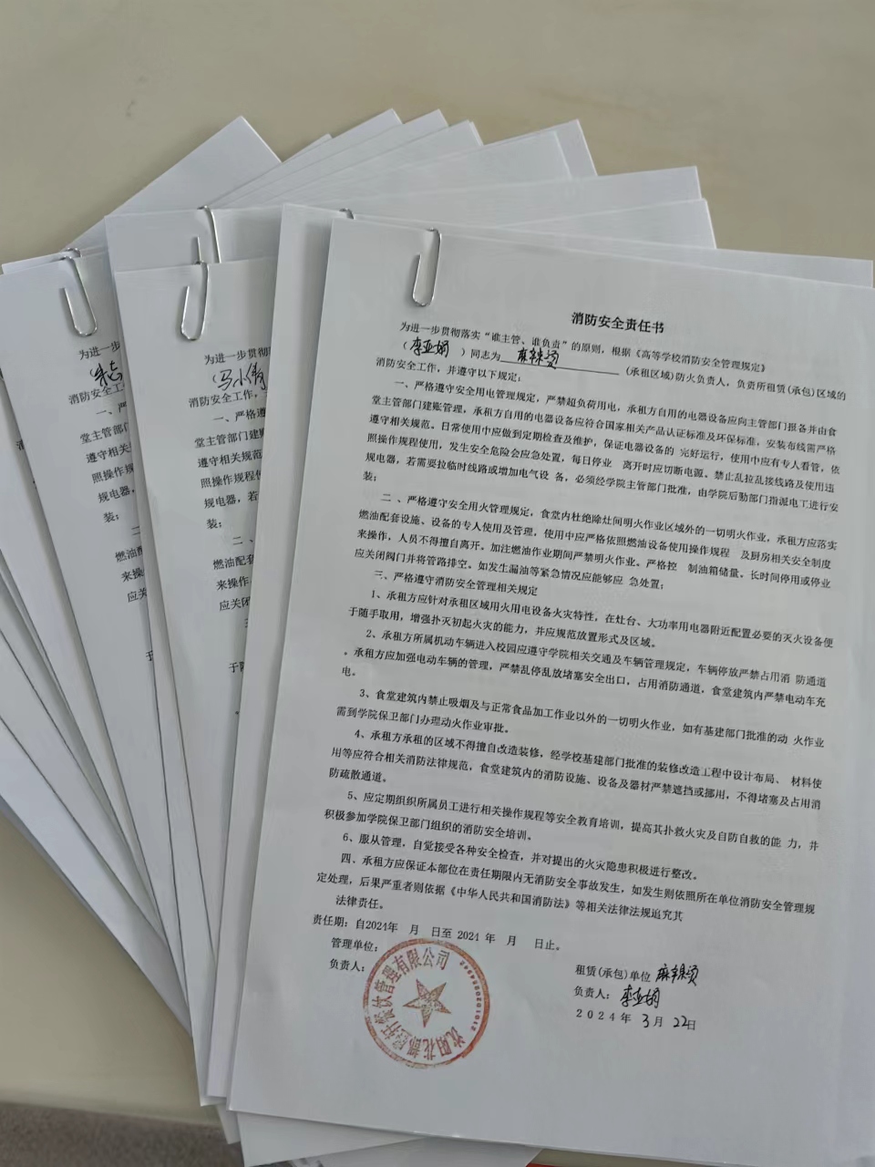 培训结束后,全体参会人员纷纷表示收获颇丰,不仅深化了对食品安全和消防安全法规制度的理解,也提高了自身的业务能力和应急处理水平,为营造一个安全、健康、有序的校园餐饮环境奠定了坚实的基础。会后,各档口统一签署了“消防安全责任书”和“食品卫生安全责任状”。