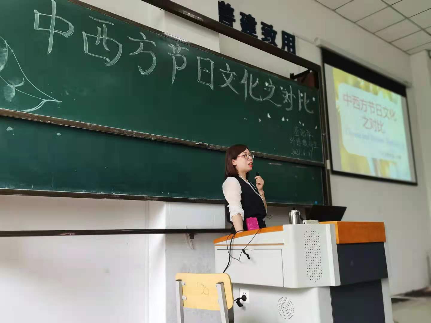 2021年6月17日,我部英语教研室刘娜老师在阶梯101教室为我院学生做了“中西方节日文化之对比”讲座。英语教研室全体老师和180余名学生参加了本次讲座。