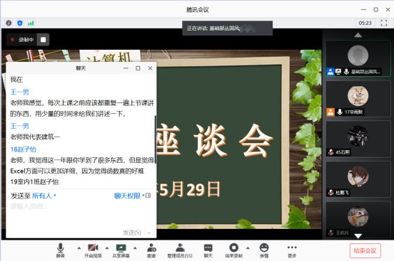 为更好了解2019级学生对学院公共基础课程教育教学全方位评价,及时、客观掌握线上教学情况,2020年5月29日下午3:30,基础部组织召开的2019级学生座谈会在腾讯会议上如期举行。来自学院各系各班级的56位学生代表参加了座谈会,会议由基础部李长友主任主持,全体教研室主任参加了会议。