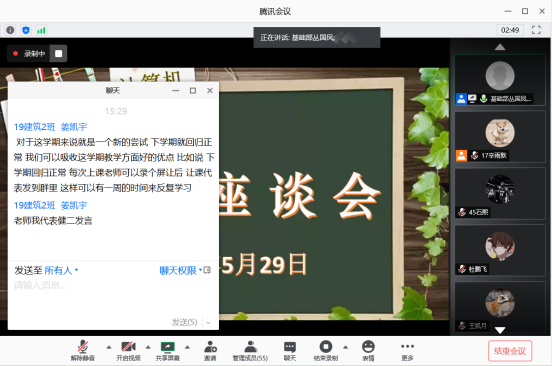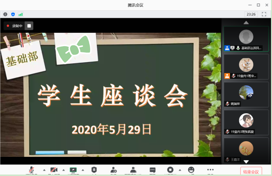 会上同学们积极发言,针对线上教学实际,对公共基础课程的的授课教师给出了鼓励和肯定,同时也对下一步教育教学提出了一些合理化建议。