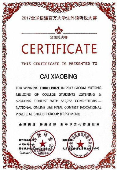 该赛事历时两个多月,来自全国100余所高职院校的14588名优秀选手同台竞技,大赛分为“校内网络听说选拔赛”(2017年10月16日—10月31日)及“全国网络听说总决赛”(2017年12月12日—12月28日)2个阶段。我院全体英语教师积极参与,悉心指导并对整个赛事进行了密切跟踪。我院2017级1100余名学生参加了校内网络听说选拔赛,经过初选共有87名学生晋级全国总决赛。经过角逐,建筑系蔡小兵同学在高手如林的全国高职高专新生组中脱颖而出。