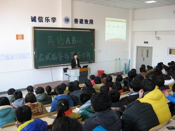 11月28日,我部英语教研室田榴榴老师在阶梯202为我院13级学生做了“英语A、B级应试指导与策略分析”讲座,英语教研室全体老师和180余名学生参加了本次讲座。