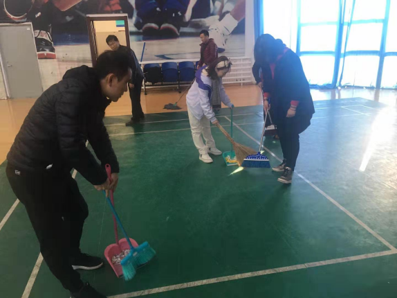 带着集中学习研讨后的“热情”,支部党员教师首先来到了文体馆,对馆内一、二楼篮球场、羽毛球场、排球场、乒乓球等场地及其周边卫生死角进行了彻底打扫。支部党员教师团结协作,密切配合,争先恐后,不畏脏累,对馆内体育器材安全、场地环境卫生进行了一次彻底“体检”。