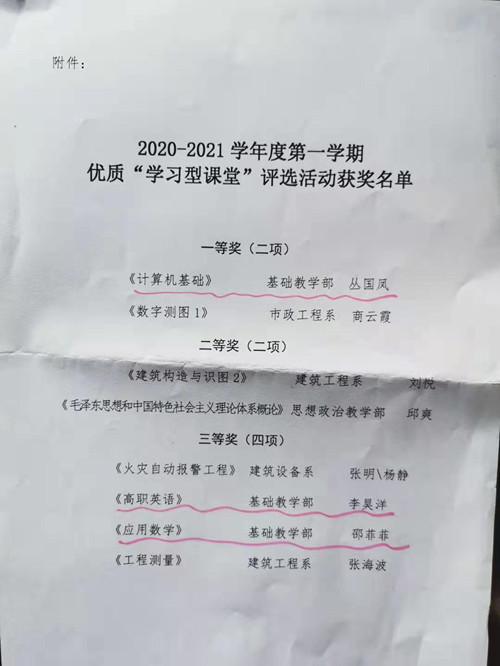 优质“学习型课堂”建设是我院持续推进教育教学质量提升的有效抓手。在本学期的活动评选中,我部门教师分别荣获一等奖1项,三等奖2项。