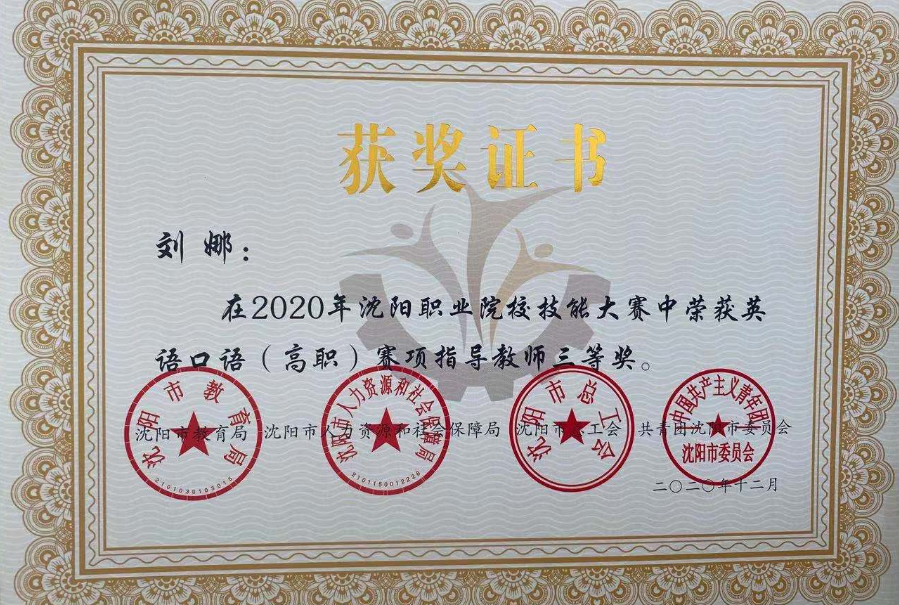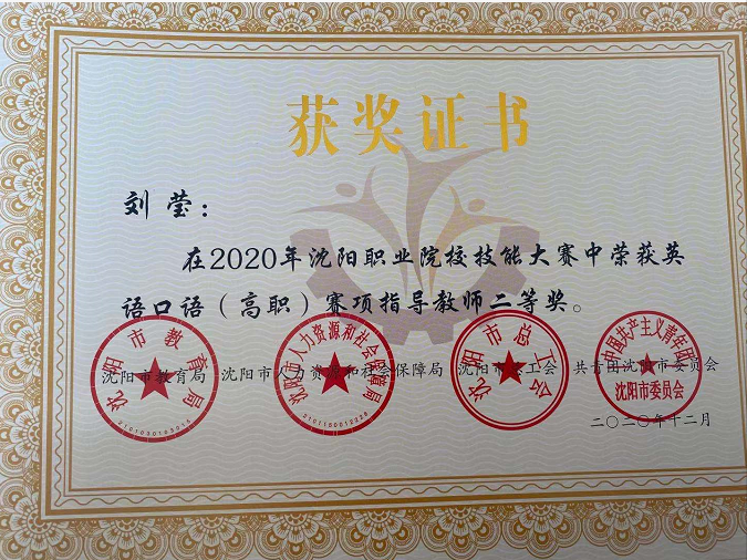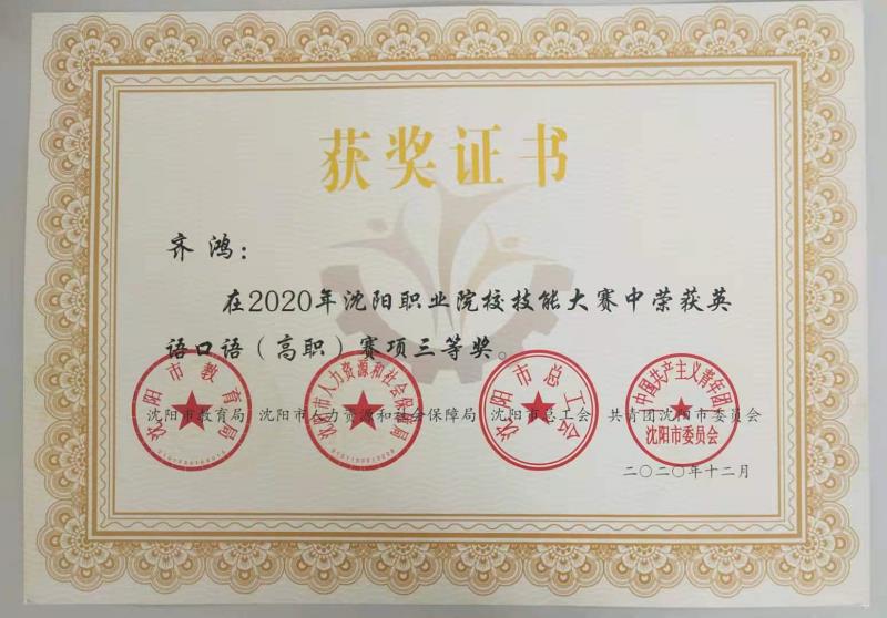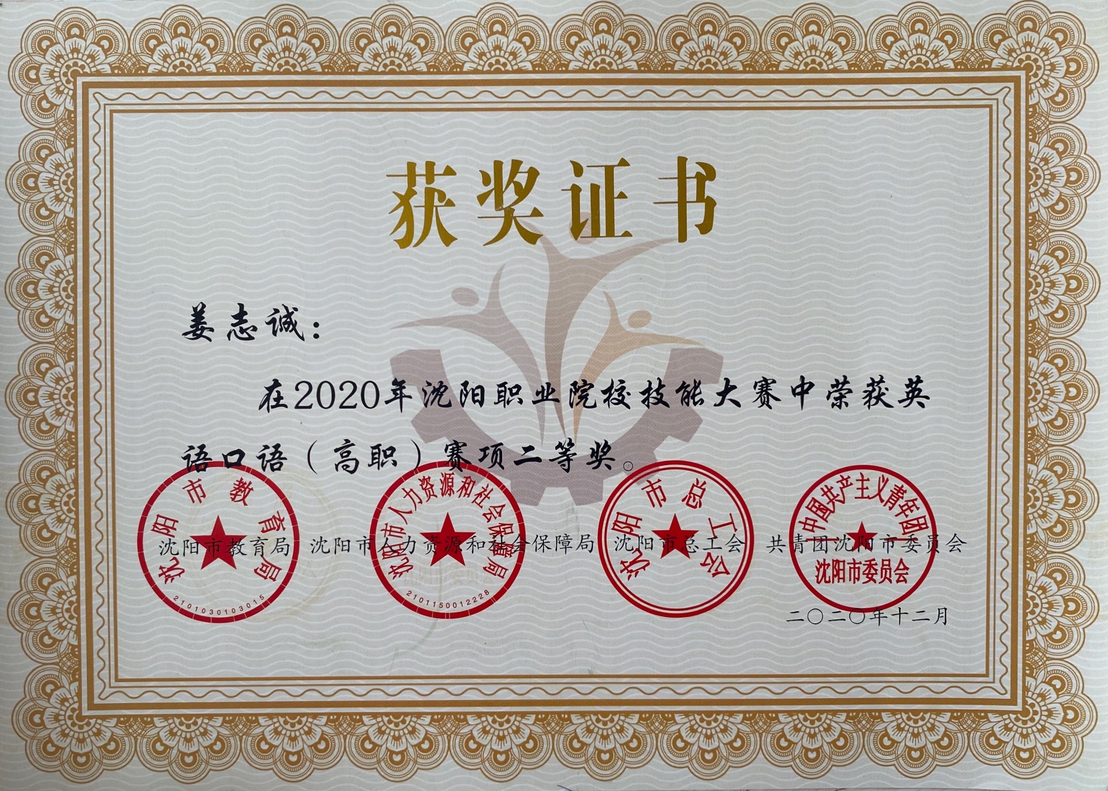 2020年6月至2021年5月,由沈阳市教育局、人社局、总工会、团市委等联合主办的2020年沈阳市职业院校技能大赛顺利落下帷幕。大赛设中职学生组和高职学生组两个组别,中职学生组设11个大类专业36个比赛项目,高职学生组设7个大类专业14个比赛项目。另设中高职衔接学生组2个特色比赛项目和中职教师教学能力比赛项目。我院选派师生参加了高职学生组英语口语赛项。