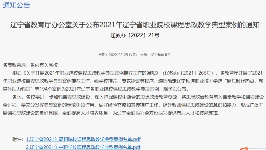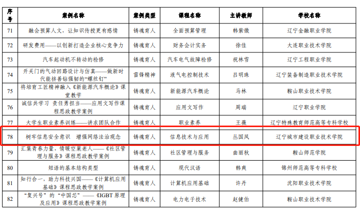 依据学院《关于开展省级课程思政教学典型案例评选和培育工作的通知》,2021年7月,部门积极进行部内优秀作品遴选并最终完成省级案例推荐2项。2022年3月25日,辽宁省教育厅办公室公布了《2021年辽宁省职业院校课程思政教学典型案例的通知》,我部报送的2个案例全部入选,其中包括刘莹老师的《青春“dream”正当时,筑梦不负新时代》、丛国凤老师的《树牢信息安全意识