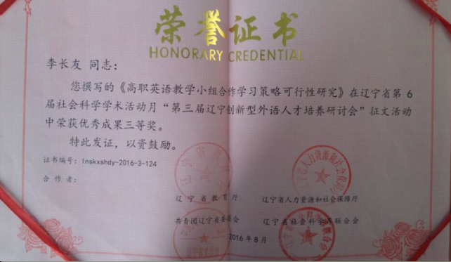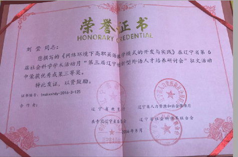 此项活动由辽宁省教育厅、辽宁省人力资源和社会保障厅、辽宁省社会科学界联合会、共青团辽宁省委员会联合举办。2篇论文能在全省200余篇高校英语论文中脱颖而出,这即是对我部教师学术水平的充分肯定,同时也是对部门今后教科研工作的巨大鼓励。