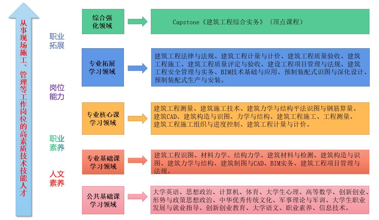 以习近平新时代中国特色社会主义思想为指导,面向建筑行业和企业需要,培养具有坚定社会主义理想信念、良好创新创业能力、国际视野和可持续发展能力,了解和掌握建筑力学、构造识图、工程测量、建筑施工、计量计价、施工组织、质量验收等基本原理,具备准确识读和绘制土建工程施工图、编制施工方案和工程量清单、开展工程质量验收、按照环保和职业健康要求科学组织施工作业,并进行质量、进度、成本、安全控制等专业核心能力,具有吃苦耐劳、精益求精、工匠精神等专业职业素养,能从事施工员、质量员、安全员、BIM建模员等一线岗位工作的德智体美劳全面发展的高素质技术技能人才。
