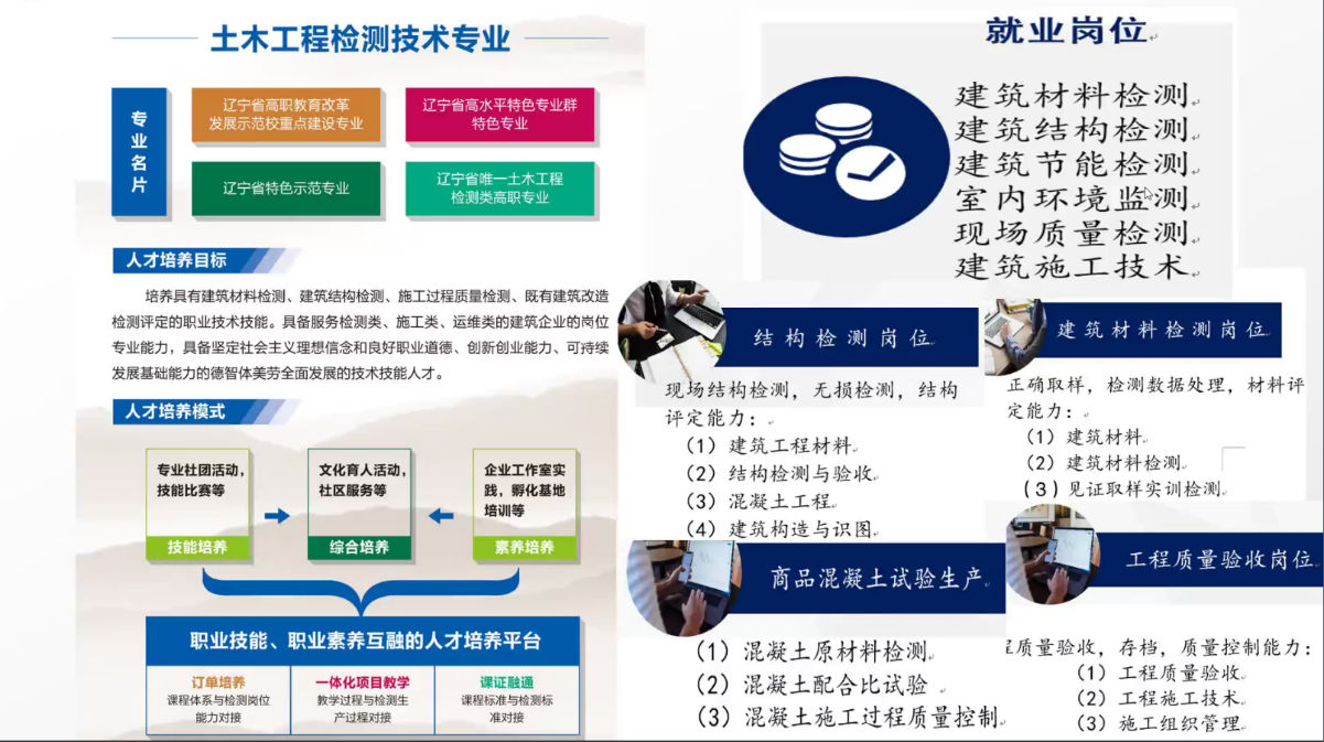 与会专家就专业发展、学生就业、技能提升方面结合自身企业特点和岗位需求进行了专业分析,着重讨论了建筑工程检测行业发展与需求,特别讨论了建筑可靠性鉴定检测和装配式建筑检测的发展与应用。提出学生要具备工作实习一年掌握专业技能、三年进行独立开展工作、五年成为业务技术骨干的职业规划。专家着重指出基础办公软件使用能力、专业行业技术能力、沟通适应能力要在校期间培养和训练;在课程中有效贯彻和实施,特别要具备试验技能、识图训练、数据分析等基本技能。会议就学院与企业共同参与智能建造“兴辽卓越”专业群建设项目交换意见,并达成广泛共识。