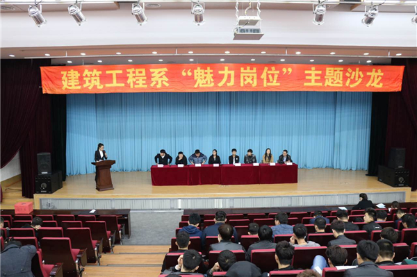 建筑工程系于3月30日下午在报告厅举办了第五届“魅力岗位”主题沙龙活动。系主任刘鑫参与了本次活动并作出了重要讲话。系党总支书记罗爽以及系其他老师参加了本次活动。 本次活动邀请已经实习、就业的王迪,杨勇,徐梓迅等8位学生代表,他们从自己的工作经历入手,生动形象的阐述了自己岗位工作的现状与工作要求,为15级学弟学妹们介绍工作经历与体会。同时通过问答的形式回答了15级同学对于顶岗实习提出的各类问题。活动最后,由建工系刘鑫主任上台讲话,对本次活动进行总结。