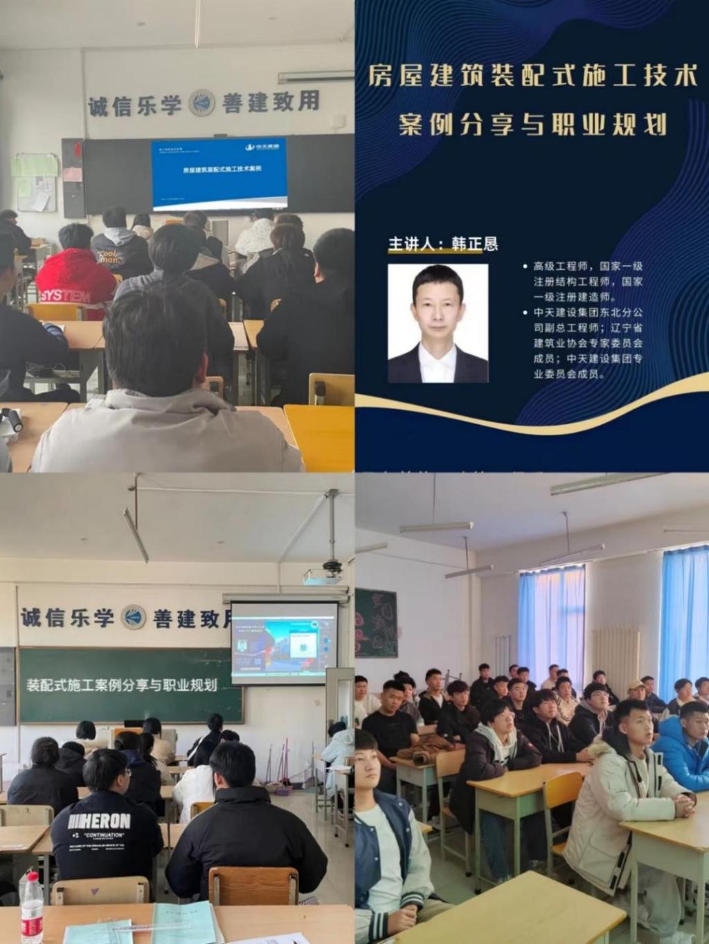 近日,建筑工程系开展了“房屋建筑装配式施工技术案例分享与职业规划”学术讲座。此次讲座邀请中天建设集团东北分公司副总工程师韩正恳作为企业导师和职业生涯导师,为同学们分享企业案例与职业规划。