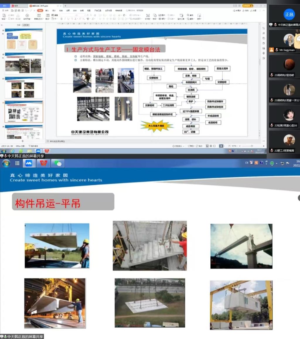 企业导师结合国家标准和行业标准分别从装配式建筑分类、混凝土结构的生产、运输、安装工艺、结构的关键技术等方面进行了介绍。