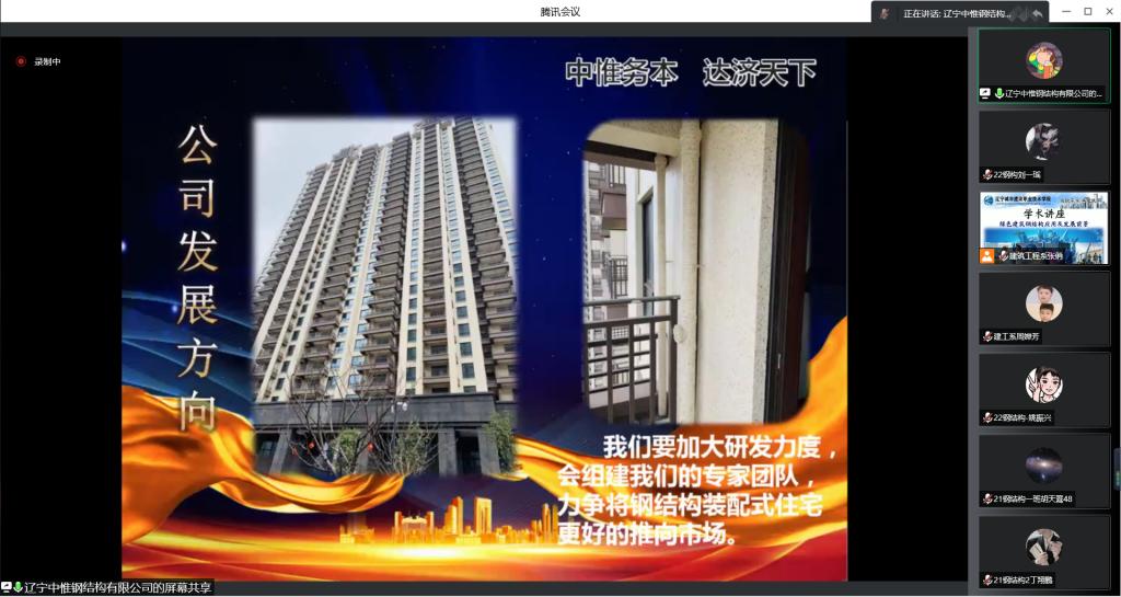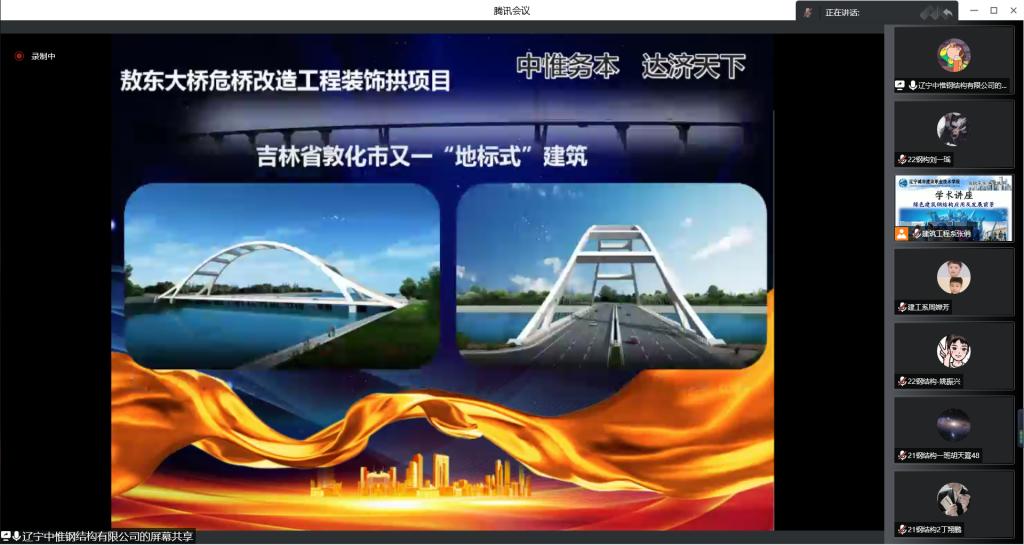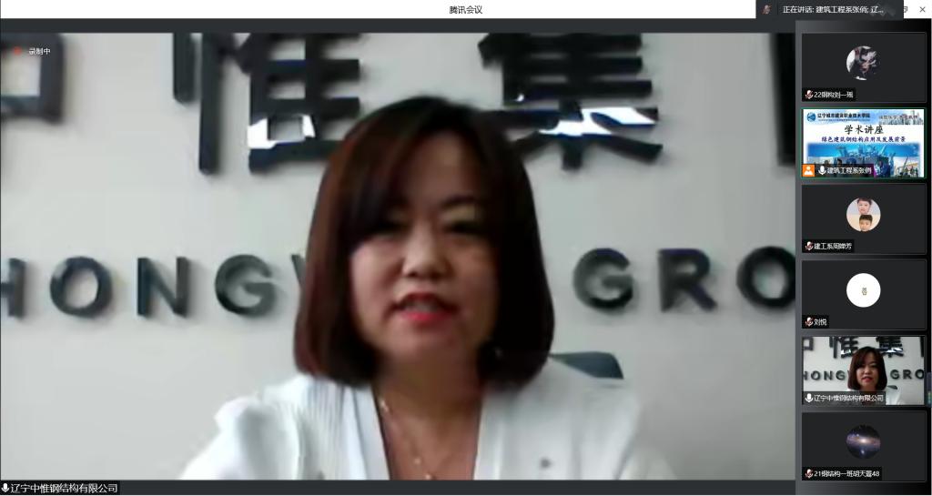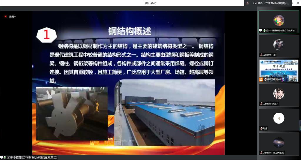 近日,我院建筑工程系建筑钢结构工程技术专业邀请沈阳中惟集团总经理,高级工程师,吉林省建筑业协会钢结构专业专家邱景秀,以线上腾讯会议的形式开展《绿色建筑钢结构的应用及发展前景》学术讲座。
