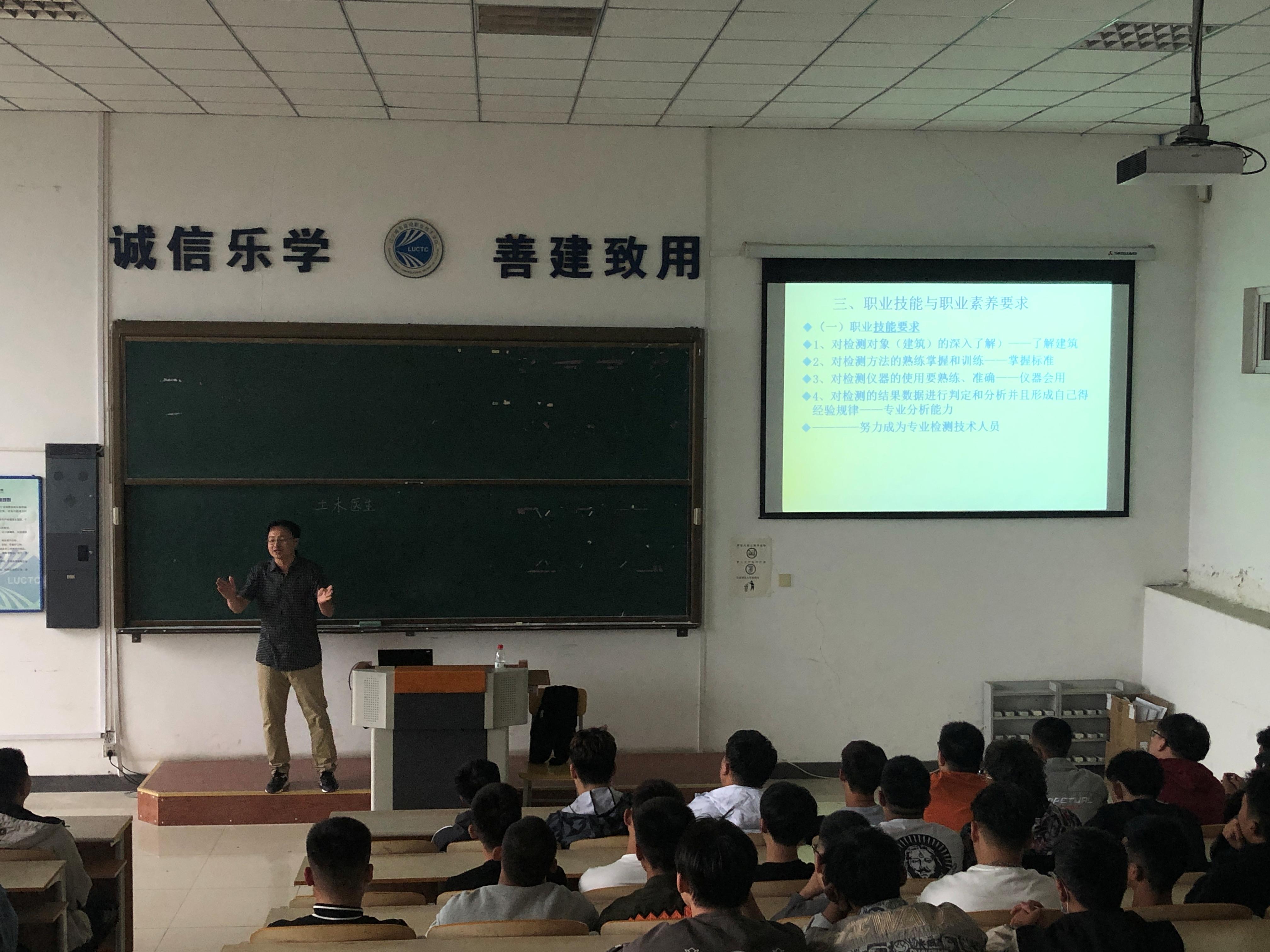 检测教研室主任尹国英老师、骨干教师王波老师为21级新生做了专业教育。介绍专业特色,专业岗位。土木工程检测专业创办以来,为我省土木工程检测行业培养出大批专业人才。在教学过程中建立职业技能、职业素养互融的人才培养平台,实现学生全方位,全过程培养,并取得了一系列教学成果,顺利通过了“辽宁省对接产业集群省级职业教育示范专业”建设验收,省示范校重点验收。专业拥有建筑材料检测,建筑结构检测,建筑节能检测,室内环境检测等先进齐全的检测设备和校内外省内领先的实训基地。优秀毕业生的岗位展示与介绍使新生对未来的就业岗位充满憧憬,检测岗位是建筑生命质量的守护神,希望同学们能够投入到本专业的学习,合理运用检测仪器,学会检测方法和相应软件,坚持科学,公正的态度为每个建筑质量把关,使土木工程检测成为一份神圣职业。