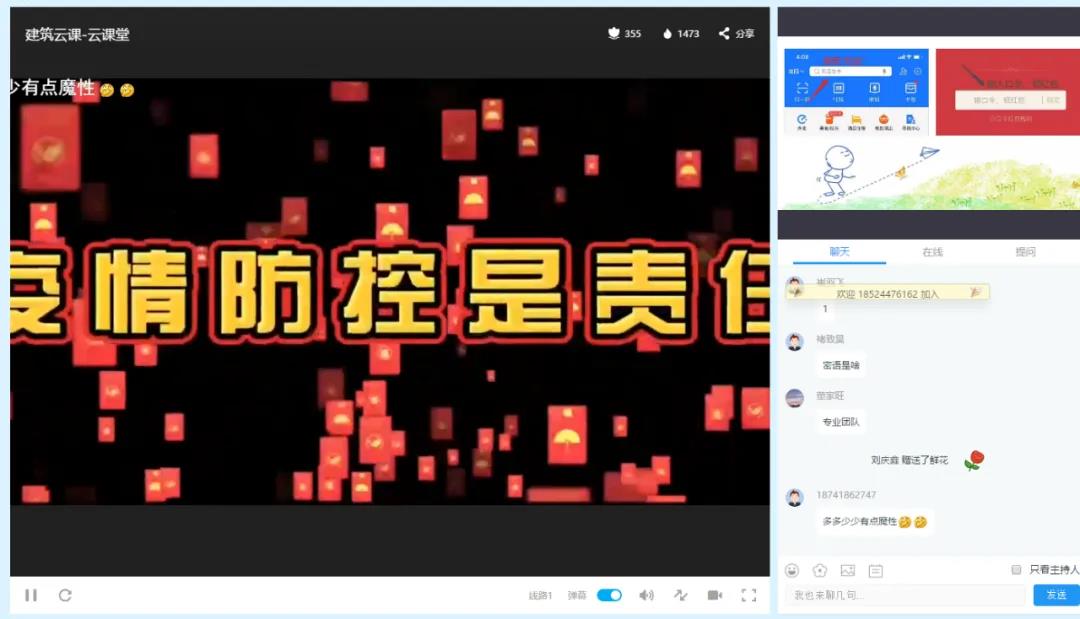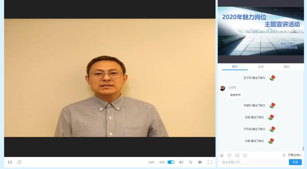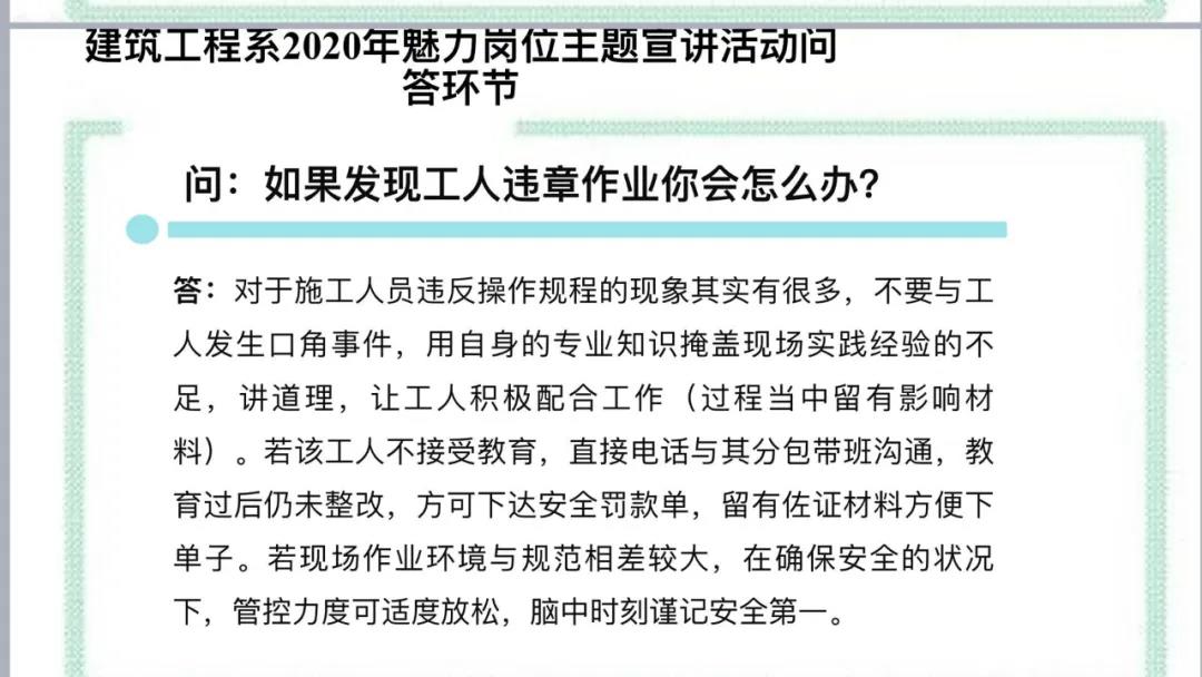 本次活动,建筑工程系请回了10名在岗实习的同学,他们分别作为10个工作岗位的代表,通过视频的形式介绍了自己的岗位。他们首先介绍了自己的实习工作岗位,结合了自己所在的岗位阐述了平日的工作内容,介绍了工作场地和仪器,工作中遇到的难题和工作技巧,鼓励学弟学妹们砥砺前行,爱岗敬业,不断学习完善自身,给直播间的18级同学提供了宝贵的实习就业经验。