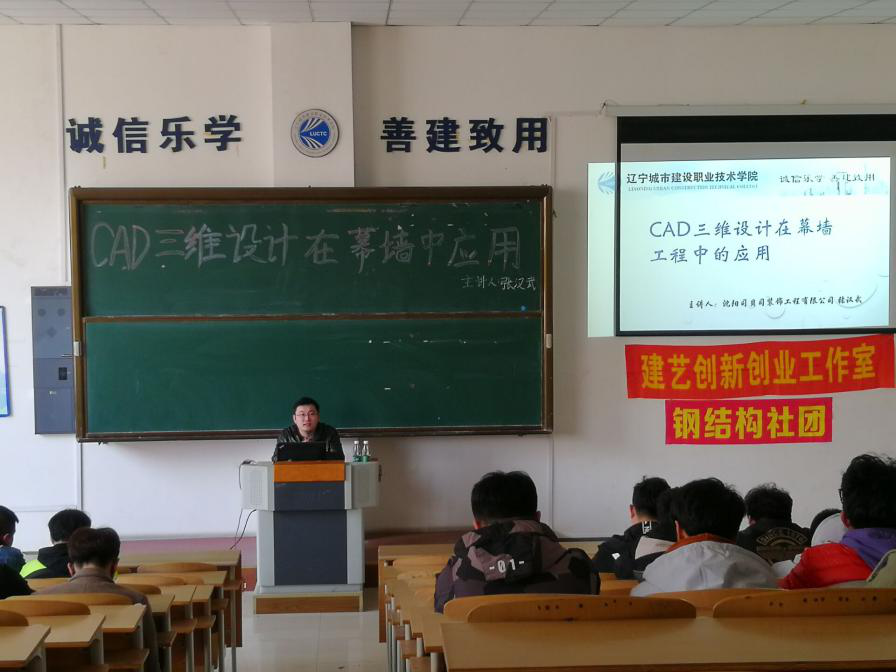 2019年3月15日,建筑工程系在阶梯教室101开展“CAD三维设计在幕墙工程中的应用”专题讲座,由沈阳司贝司装饰工程有限公司主任设计师张汉武主讲。本次专题讲座的目的旨在提高学生的三维空间想象能力,拓展学生的软件应用能力,让学生在校学习的内容更加多元化,拓展专业领域知识与技能。